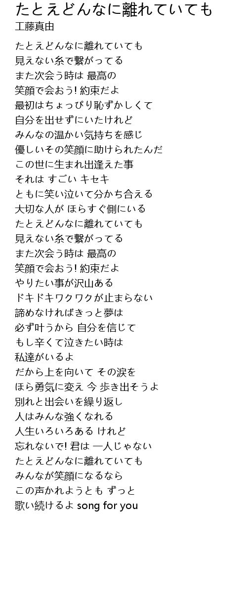 どんなに離れていても あなたが側にいてくれる 歌詞検索lyricjpcomでは、無料で歌詞の検索・閲覧サービスを提供しておりますが、著作権保護の為、歌詞の印刷、歌詞のコピー、歌詞の複写などを行うことはできません。 どんなに離れても このまま いつまでも時間 (トキ)を止められたら あなたと 寄り添って 二人でいたい 会えない時間 (トキ)が二人 近づけるの不安にさせたくない君の 気持ち気付いてるよ 無邪気に笑う君の 指に光るお揃いのリングは どんなに離れてる時も 力を分けてくれるようで あっという間の時間に 二人言葉も少なくなって 気がついたら 無言のまま 瞳潤ませる君 I don't wanna go そばにいて